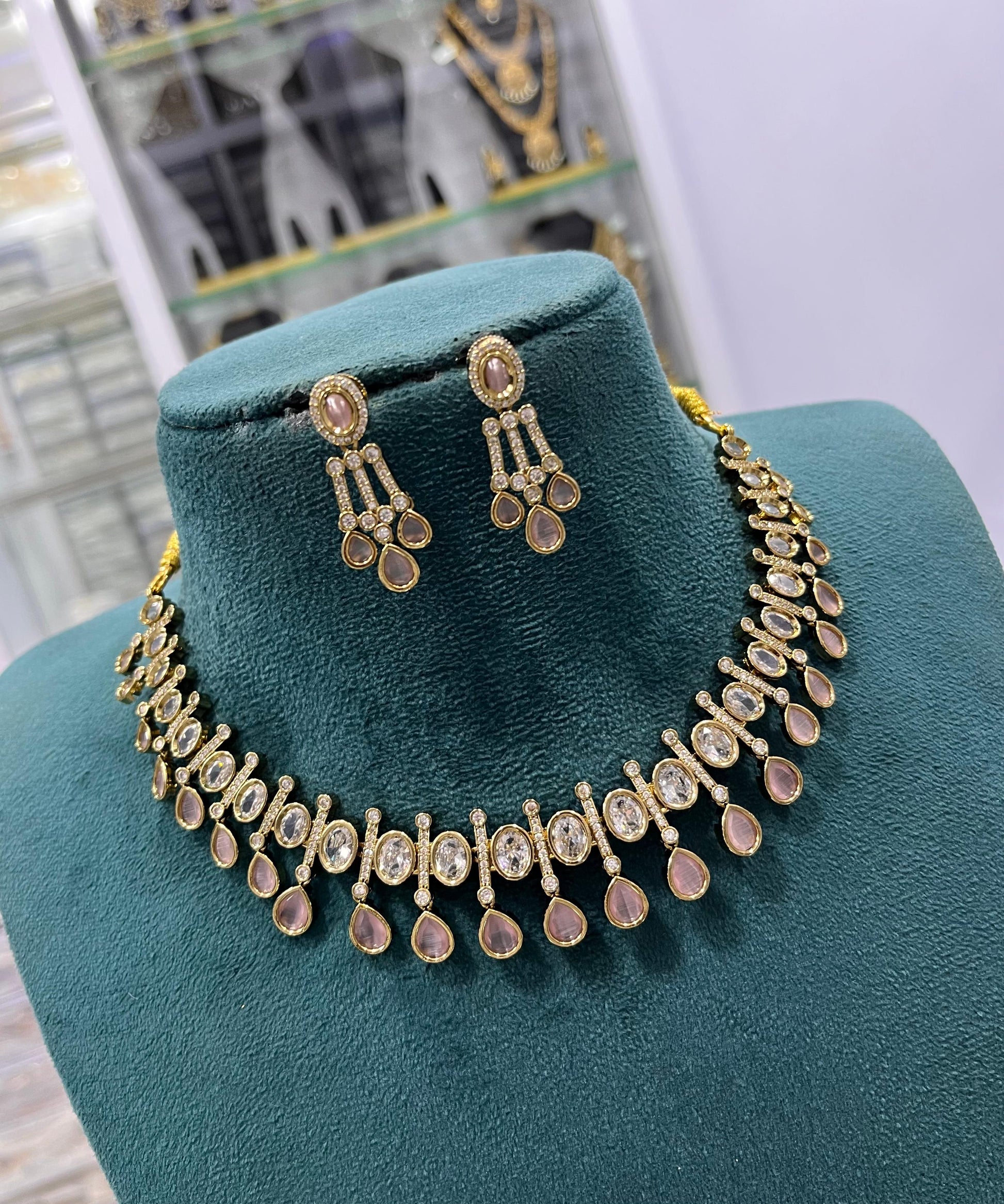 A tribute to the timeless heroine, Nayika is a jewelry set crafted for moments of grace, poise, and quiet power. Featuring a necklace and matching earrings, the design unfolds in rhythmic symmetry—alternating circular and teardrop elements that echo the balance between strength and softness. Ideal for weddings, festive gatherings, or any occasion where presence becomes poetry, this set invites the wearer to step into her narrative with elegance and intention.