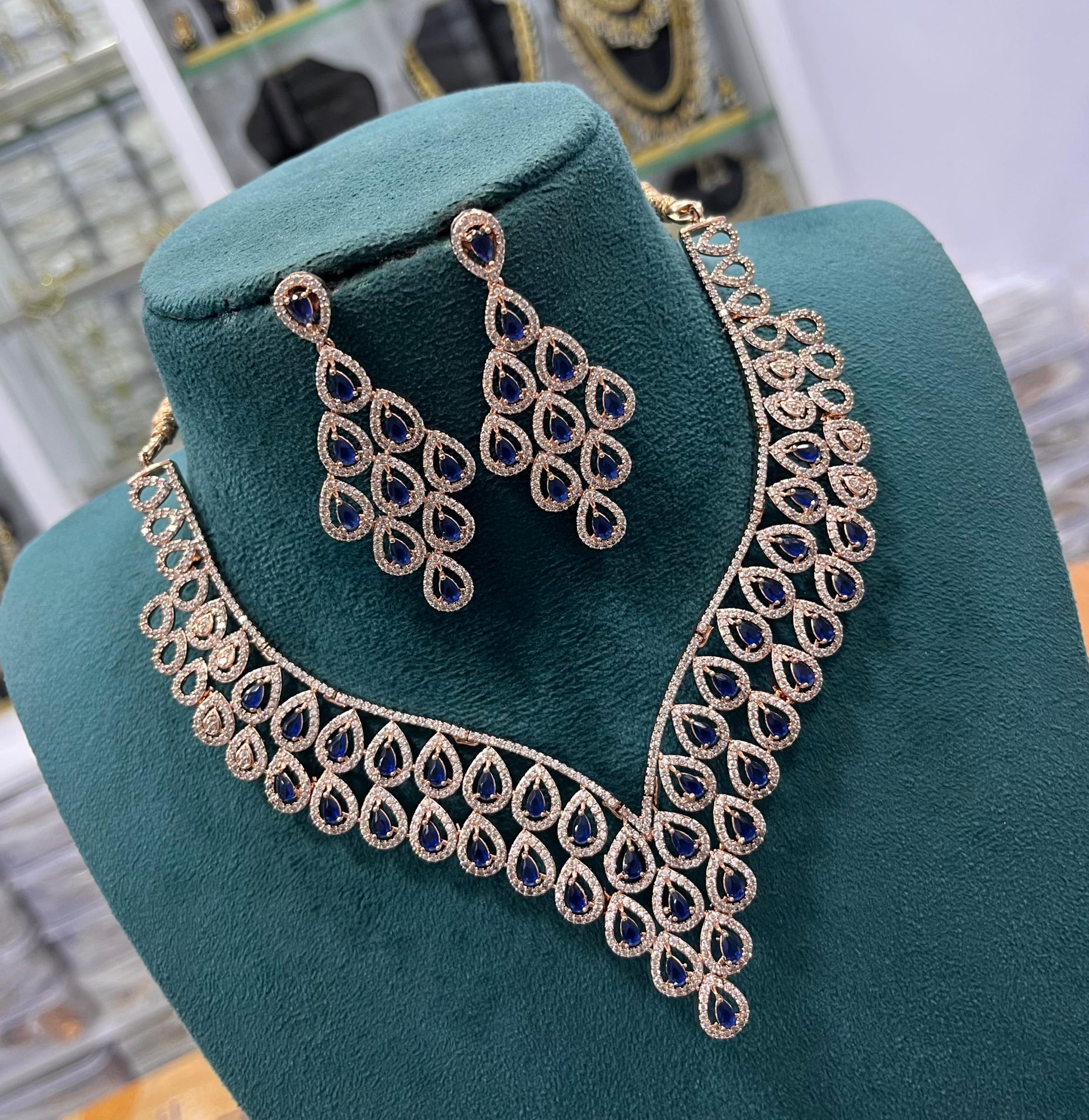 A graceful descent into brilliance, Blue Cascade II is a jewelry set designed to evoke movement, clarity, and regal charm. Featuring a necklace and matching earrings, each piece showcases teardrop-shaped blue gemstones bordered by shimmering clear stones, arranged in a symmetrical, flowing pattern. The earrings mirror the necklace’s elegance, creating a cohesive look ideal for weddings, receptions, or evening festivities.