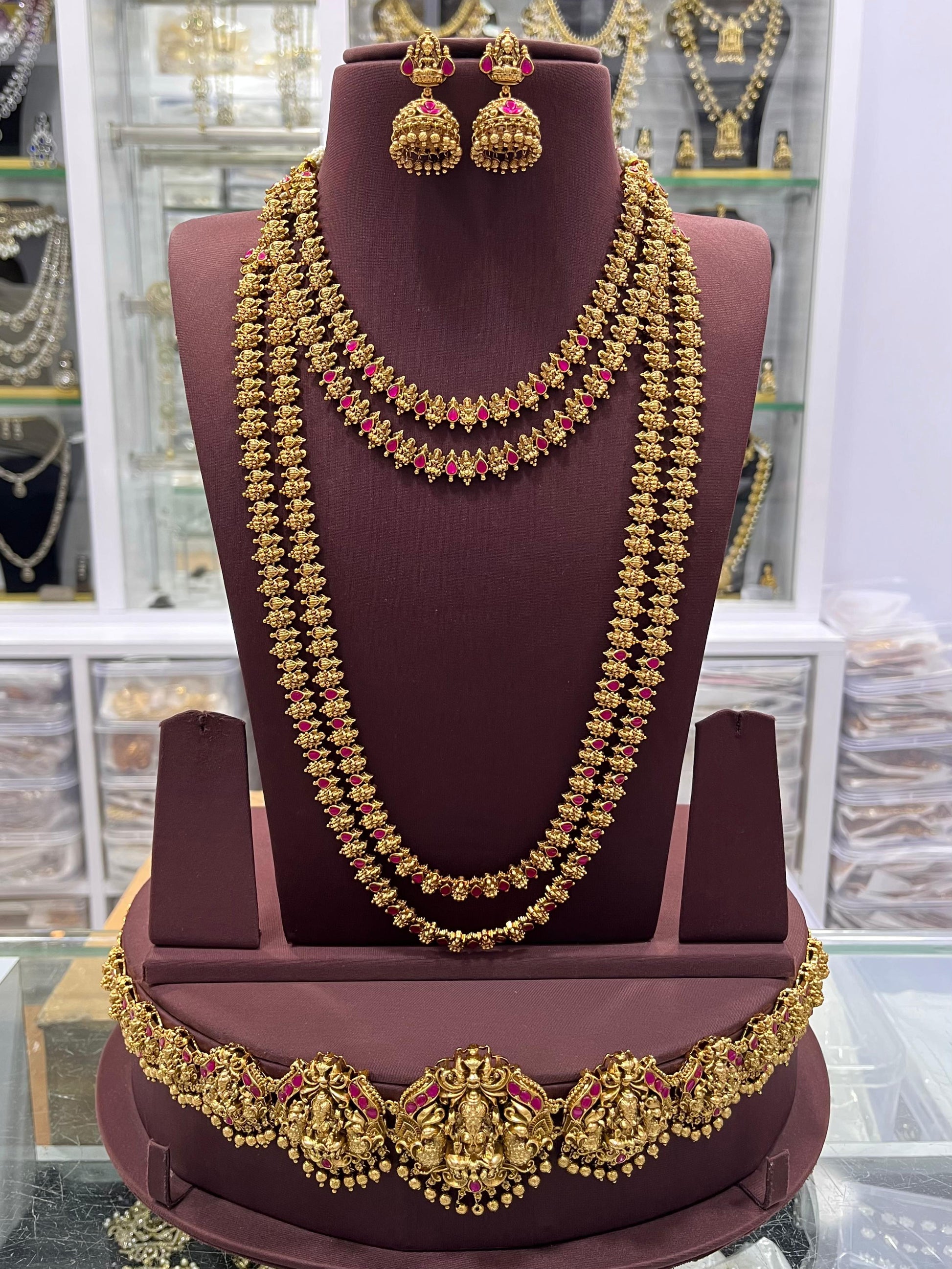 A majestic tribute to bridal tradition, Swarna Sabha is a complete ceremonial jewelry set featuring three layered necklaces, statement jhumka earrings, and an intricately crafted waist belt. Adorned with gemstones and detailed deity motifs, each piece reflects the artistry of temple-inspired design and the spirit of sacred gatherings. The vaddanam anchors the ensemble with divine symbolism, while the layered necklaces and earrings offer rhythm, richness, and regal symmetry.