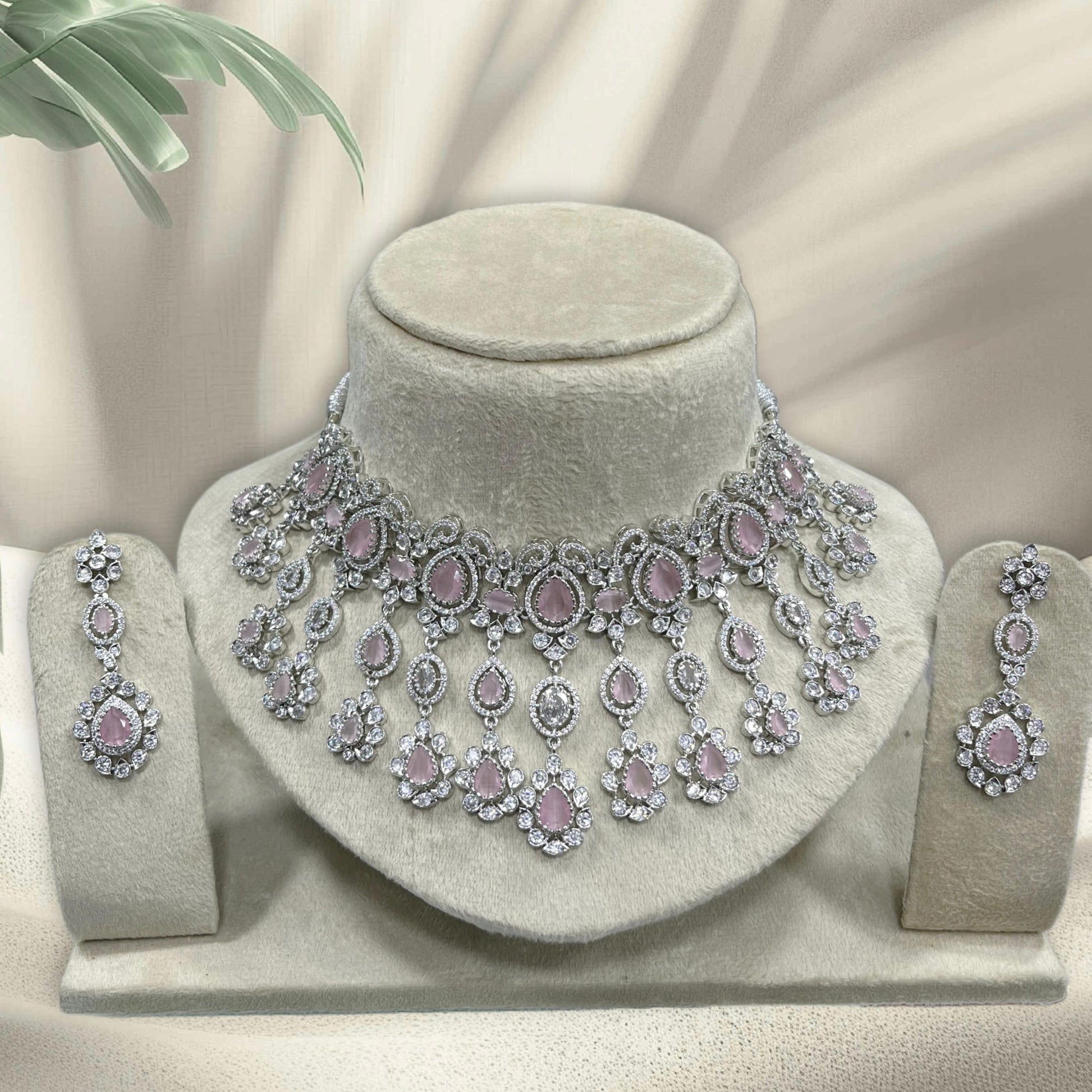 The Vilasini necklace set is a cascade of elegance, where color-hued teardrops meet shimmering silver-toned artistry.