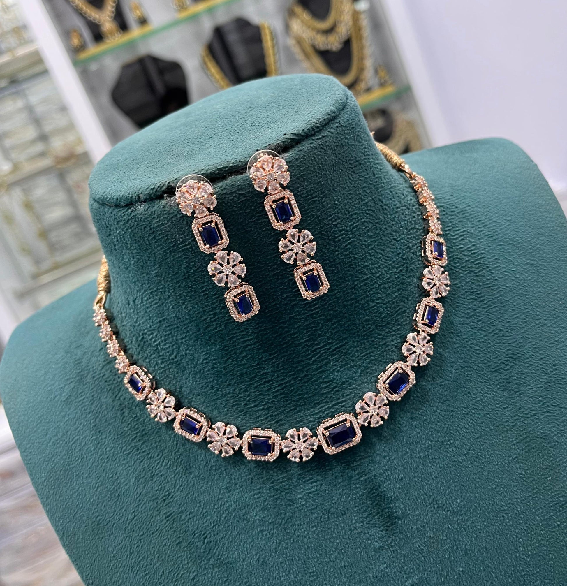 Featuring a necklace and matching earrings, each piece is adorned with alternating floral motifs and rectangular blue gemstones, set in warm gold-toned metal. The design balances softness and structure, making it ideal for festive occasions, evening gatherings, or bridal celebrations that call for a touch of regal calm.