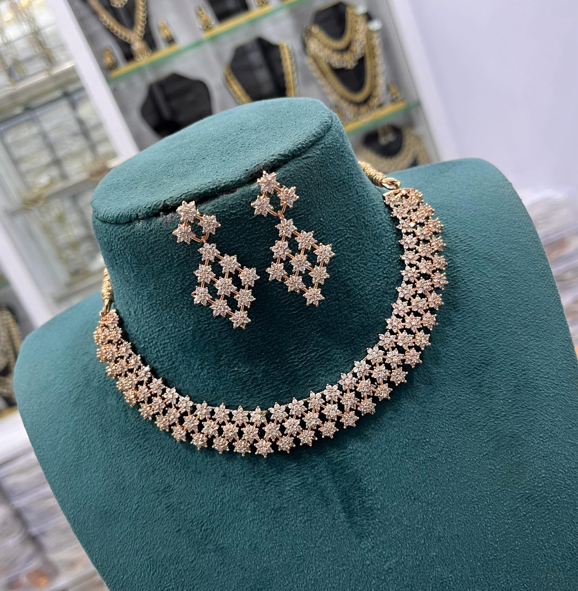 A soft shimmer with timeless charm. This handcrafted necklace and earring set features radiant circular motifs, each centered with a luminous stone and framed by delicate accents.