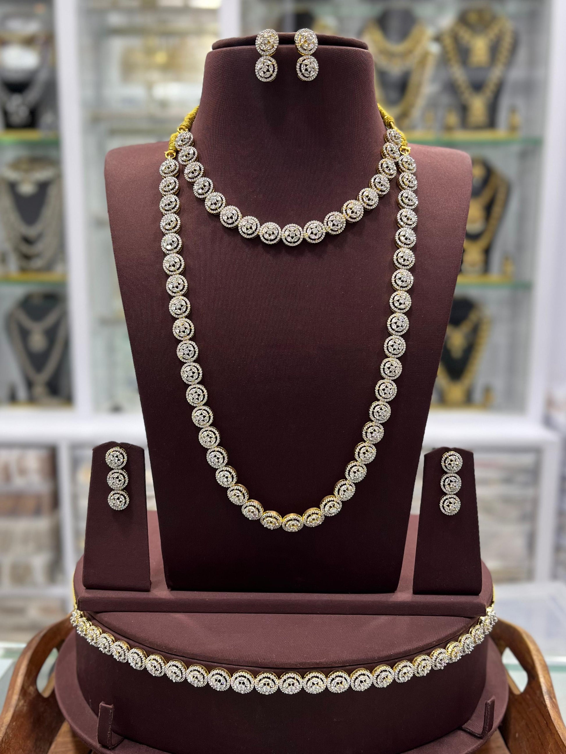 The Tara Jyoti II Ensemble is a symphony of sparkle and sophistication. Featuring a layered necklace duo, statement earrings, and waistbelt each piece is adorned with teardrop and marquise-shaped elements encrusted with brilliant stones.