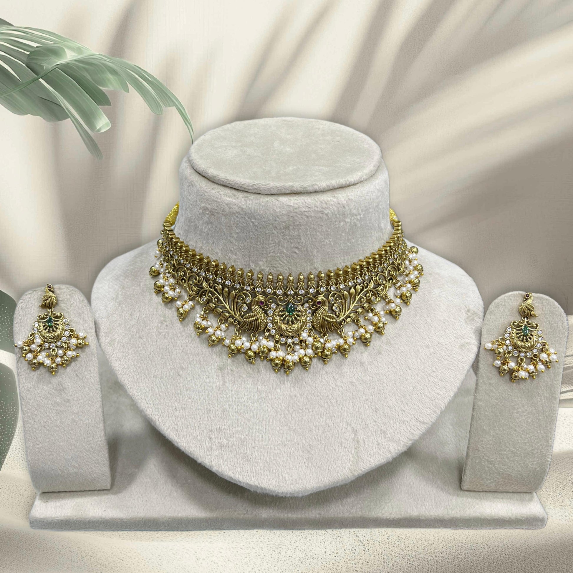 The Harini choker set is a portrait of quiet grace. Featuring a central green gemstone framed by intricate gold-toned detailing and delicate pearl drops, this necklace and matching earrings evoke the elegance of forest light and temple traditions.